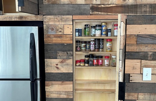 You will be making meals like home in this fully stocked kitchen with all the equipment you will need. You will be relaxing and enjoying the big game or latest movie with the living room's cinema like big screen tv. This home seamlessly blends nature and color in a warm and inviting atmosphere. The open-plan kitchen, dining, and living area boasts a harmonious color palette with striking wood accents. Reclaimed wood walls, secret cabinets, and waterfall countertops add a touch of rustic elegance.