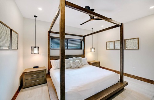 TheseBRAND NEWluxury suites havebeen impeccably furnished to provide the very latest in both style and ambiance. If a laid back, luxurious experience is what you have in mind for your next retreat, a Bali Hai Beachfront Resort and Spa luxury room is the perfect choice. This Luxury Suite with King bed and pool view room is just steps from our private beach and boasts sliding glass doors that open to a spacious, furnished balcony or patio overlooking the large, sun filled pool area. Lavishly designed with the guests comfort in mind, these rooms feature King canopy bed (1 King) with superior bedding, huge smart TVs in both bedroom and living area, cypress root tables, carved wood accents, and all the comforts of home. Wood grain tile and floating shelves adorn the newly designed kitchen. Full private bathrooms feature smart lighting with back-lit LED mirrors, tub/shower combo, and come with complimentary toiletries. The suite provides a convenient separate living area with a queen pull-out sofa to enhance your stay, as well as a dining area for meals.Room amenities include hair dryer, iron/ironing board, fridge/freezer, microwave, beach/pool towels, wi-fi, cable television, and full use of all on-site amenities like heated pool, parking, beach loungers and umbrellas, and spa/massage services. Don't forget to stop by the Bali Hai Lounge for your favorite cup of Joe, a bite to eat, or perfectly crafted libation.This room can accommodate up to four guests.