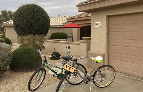 Enjoy this comfortable, fully furnished, 1278 sq ft home with an open floor plan, featuring 2 spacious bedrooms and 2 full bathrooms, with a desk nook in the family room. Sip an iced tea under the umbrella on the large front patio, or retreat to the backyard patio to watch the bunnies play while you grill up steaks on the BBQ. There are two bikes and folding chairs in the garage for local outings. Close to fitness centers, golf, pickleball, tennis and aquatics. Beautifully landscaped yard in a friendly neighborhood. No pets/smoking.