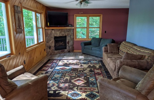 Relax listening to the sound of flowing water while you grill on the spacious deck overlooking the river, or by a campfire right next to the water. Wade in to fish, catch crayfish, or simply to let the water flow around you.
