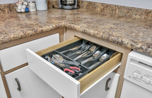 The primary bedroom has a private bathroom attached with a shower and tub combination. There is ample seating at the kitchen bar and a table for additional dining or workspace. Cook dinner with the family and/or relax with the water view from the living area. This is a great spot for families, couples, or to just getaway and enjoy the view!
