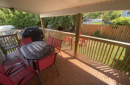 The backyard has a covered deck attached to the cottage overlooking the whole yard where your can BBQ and eat at the outdoor patio table. In the yard, a large raised stone fire pit can create a magical evening wile roasting marshmallows, having a glass of wine and talking into the night. There is a covered swing where you can enjoy, play cards, or having a drink; rain or shine. Other games such as Yardzee with large wooden dice, Bocce are available to play in the yard.