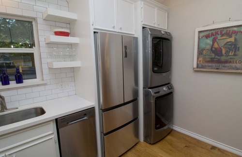 The kitchen is fully stocked with all brand new tools and utensils. It has all new appliances - electric stove, microwave, refrigerator/freezer, dishwasher and washer & dryer. It has a peninsula with 3 bar stools. We will provide filtered water and coffee. The dining room table seats 8 (two benches and two end chairs).