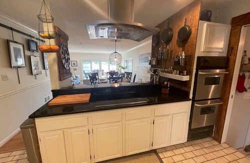 The interior offers 5 bedrooms, three full baths and sleeps 14 comfortably. Interior dining area seats 10. Full kitchen, laundry and ample parking. Two full bathrooms with tub/shower configuration on 2nd floor and one full bathroom with walk-in shower on 1st floor. Two living/family rooms with plenty of seating for everyone and smart TVs. Peloton is available for those that have knowledge of how to use it, a Peloton account and proper locking shoes. (Absolutely not for children). Our home is great if you have members of your party that can't do a lot of stairs - one of the bedrooms and full baths are located on the first floor, with minimal stairs.
