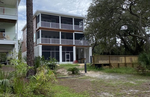 Steinhatchee’s newest and most modern vacation home. Brand new two story coastal home, nestled in a gated community called Jena Jubilee. This new home is located on the Steinhatchee River across from River Haven Marina. Boasts two master suites, plus three lovely guest rooms. 5 Bedrooms, 5-1/2 Baths in all. Private dock with private covered boat slip. Screened in gaming area, ice machine and fire pit on ground level. Three beautiful screened in balconies. Private clubhouse with outdoor kitchen and pool. Card/poker room with nice gaming table. Ping pong, foosball, darts, and corn hole in the gaming area. Bath porch cooking area with 2 grills and outdoor cookers for your use. Newley re-landscaped and looking beautiful for the season.