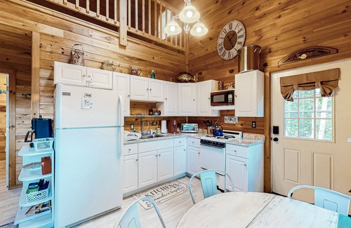 The interior is classic and open, offering lofty ceilings and atmospheric wood paneling. There's an eat-in kitchen with every essential and a living room featuring plush seating, a smart TV, and a gas fireplace to warm you as you watch movies and play board games. There are two bedrooms - both on the main floor - and complimentary WiFi throughout the house.