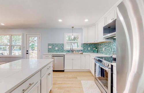 The centrally air-conditioned interior is bright, breezy, and open, with views of the water framed by generous windows. Enjoy a well-equipped kitchen with stainless steel appliances, both a breakfast bar and a farm table for dining, and a living room that's ideal for gathering. In the evenings, stream movies and sports via Hulu+ and Hulu Live, and leave the day's swimsuits and towels to spin in the washer/dryer. Of the three bedrooms, one features an en suite bathroom and its own TV; another offers a desk workspace where you can log onto the complimentary WiFi.