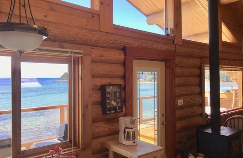Unobstructed views from this beautiful Oceanfront Log cabin in Gilles Bay, Texada Island, British Columbia. Relax on the oceanfront patio while watching the Eagles, Vultures, Blue Herons, and Hawks Soar over the ocean just off the deck. The perfect retreat for couples to unwind or families to make lasting memories. The beach is famous for the summer sandcastle competition. Miles of sand, tide pools, and sealife spread across Gilles Bay making the bay a perfect place to swim in the warm ocean, paddleboard and kayak. 9-hole golfing, hiking and a convenient 5 min walk to the local general store that supplies all groceries and liquor.