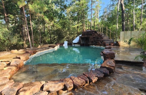 Relax with the whole family in a magical forest! Your day begins sipping coffee overlooking a beautiful fully stocked one acre pond surrounded by 60 foot pine trees. For a adventurous afternoon imagine fishing off your front deck and taking a ride on a canoe exploring the ponds unique features such as turtles, ducks and other wild life. Experience beautiful a sunset why'll BBQing off the patio. Between the gigantic pines and pond with a fountain this makes for a perfect wedding venue! If you are looking to venture to Lake Conroe for a day trip we do have a Pontoon boat for rent that is already in a boat dock ready to go for a day trip! The kids love to go tubing and the tube is included. Message me for more information.