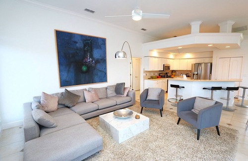The primary suite is a serene retreat with a king bed, Smart TV, water views, and private access to the pool area. The en-suite bathroom is spa-inspired with dual sinks, a soaking tub, and a spacious walk-in shower. The second bedroom also features a king bed and TV, while the third bedroom is perfect for kids with two bunk beds (four twin beds total) and a TV. The shared guest bathroom is conveniently located between the guest rooms.