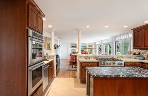 The Living Room faces the water with direct access to the wrap-around deck through three sets of French doors and a staircase to the back gardens and deep water channel. The Living Room also has a wood burning fireplace! Directly behind the Family Room is a large, screened porch for waterfront dining and boat watching.