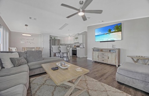 The home has been recently fully renovated and updated to provide you with all of the niceties of a modern vacation paradise. This includes Rokus for Netflix/Hulu/Amazon usage with each TV in the living room and both bedrooms, LED/Bluetooth controlled living room vent with music playing capabilities, adjustable LED ceiling fans/lights, and (of course) an adorable LED neon sign along our shiplap kitchen accent wall for those group pictures “for the gram”!