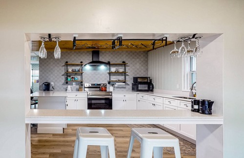 Inside your home away from home, discover updated living quarters and charming finishes. Sit back and enjoy watching your favorite TV shows and movies on the large TV in the living room. Or, don your chef's hat and utilize the well-equipped kitchen's stainless steel appliances and gleaming countertops. The separate guest house also comes equipped with a kitchenette, ensuring there's enough room for everyone to prepare and store their meals.