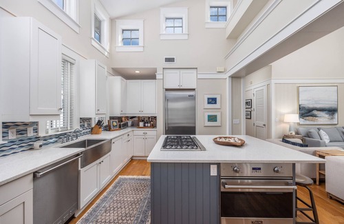 This property comes with a main house that sleeps 4 and a carriage house that sleeps 4. Perfect for two families or families that love to have some space! The main retreat has a master bedroom with a king bed and a guest room with two twin beds. The master bath has a large walk in shower, soaking tub, and double vanity. The guest bath has a single vanity and tub/shower combination. The living room has plenty of seating with two couches and two club chairs. There is a spacious kitchen with all the necessities to prepare a wonderful meal. The carriage house has a bedroom that includes a king size bed and a bathroom with a single vanity and walk in shower. The living room of the carriage house has a set of bunk beds. The kitchen in the carriage house is small but has everything you would need to prepare meals (stove/oven, refrigerator, kitchen supplies).