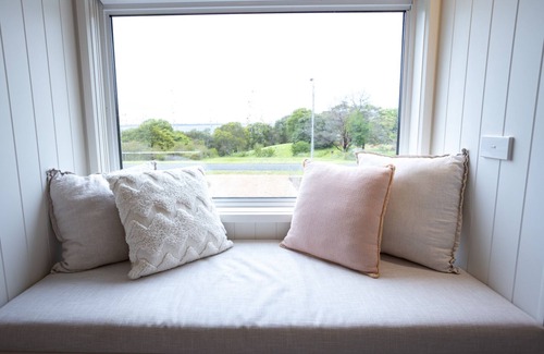 The main bedroom features a plush queen size bed adorned with the softest linen and a charming window seat perfect for watching the incredible sunsets. The second bedroom, our cozy bunk room, boasts a double bed with a single overhead and a functional desk space that provides water views for those who need to work during their stay.