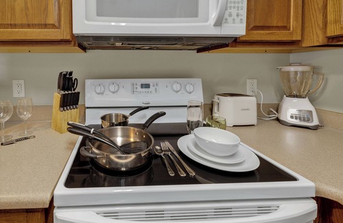 All the comforts of home are provided including a fully equipped kitchen with all modern appliances that is stocked with plenty of cookware and dishware. Washer and dryer, WiFi, and Smart TV’s are all included. The master bedroom includes a private bath with shower-tub, and the central hallway bath has a walk-in shower. The condo comfortably sleeps 6 guests in a queen bed in the master, queen bed in the guest room, and full size sleeper sofa bed in the living room. All bed and bath linens are provided.