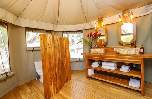 Located up a private path is the gorgeous custom made teak themed Glamping tent. Complete with king size bed, built in closet, coffee bar complete with fair trade coffee, double vanity and shower with custom Vitiver and Rose scented eco-friendly toiletries and an Apple TV with concierge services. This tent is sure to impress - enjoy a short 5 minute walk to Playa Penca and soak in the beauty that surrounds you.