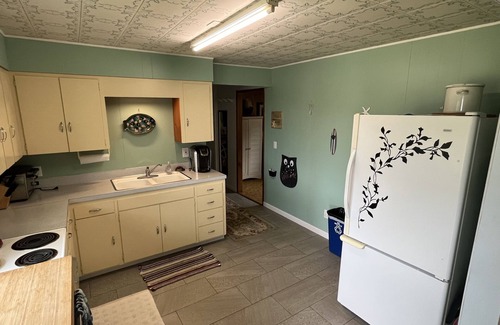 Single level home. Living room, dining area and kitchen. Separate den/kids playroom. Full hall bath. Bedroom with queen bed. Bedroom with 2 twin beds. Detached garage not fully available but has storage room and outside 1/2 bath. Parking for 3 cars. Laundry facilities in the garage, family room has a desk with monitor, and the couch in living room turns into a double size bed.