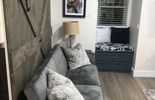 Enjoy our new studio apartment all to yourself less than 2 miles from Beaver Stadium & the airport. Comfy interior that sleeps (8) with (2) Queen Murphy bed & (2) futons, plus more seating. Large barn door separates the area with 2 beds on each side. Island seating & coffee bar. 58" & 37" Smart TVs. 1-1/2 baths. One of a kind gallery art. Private entrance from large 2nd story deck with grill, umbrella & beautiful furniture for lounging or eating while you enjoy the scenic nature surroundings.