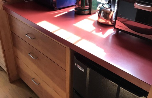 The kitchen is creatively functional. A single burner unit, electric frypan, large toaster oven, mini microwave, large dorm-style fridge, and deck-side BBQ make this a great space for easy-peasy cooks. Coffee maker & tea kettle included.