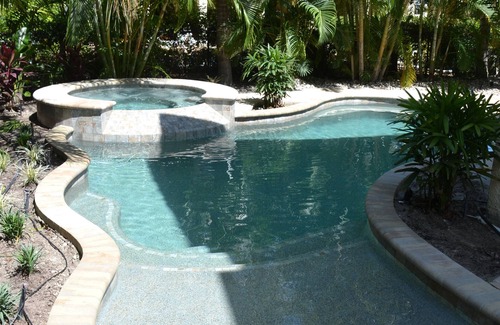 Plenty of room for all the family to chill around the free-form private pool & hot tub The special non-slip pool surface complements the 'beach access' that allows the young (and not so young) to enter into the water without any steps and starts at 2 inches deep! Our guests just love this private Oasis - please see our numerous 5* Reviews!