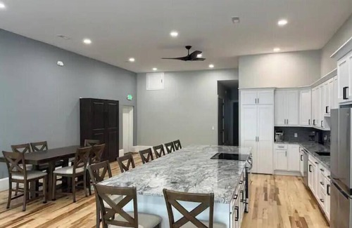 The whole group will be comfortable in this spacious and unique space! Boasting 1875 sq feet, this oversized 2 bedroom 2 bathroom piece of heaven is sure to impress! With 12' ceilings, 8' doors and a 14' island you will have plenty of room to entertain, yet it is very cozy and enjoyable snuggling up to the fireplace and watching the traffic/people on Main street stroll by. There is a 120" screen to watch movies or the game, and don't forget to relax in 1 of the hanging chairs while reading!!