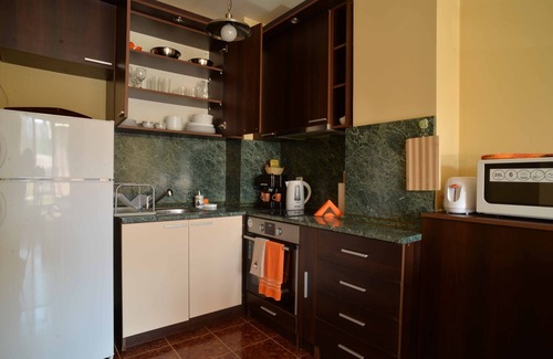 The apartment offers a free Wi-Fi access and a cable TV. The living room comes with a comfortable sofa which turns into a nice bed. There is also a coffee table, a dining table with four chairs and a TV. The kitchen is fully equipped with a fridge, an oven, a washing machine, a microwave, a toaster, a kettle and everything you need to cook a delicious meal. The spacious bedroom comes with a bed with bedside tables, a big wardrobe and dressing table. The bathroom has a separate shower and a sink with mirror.