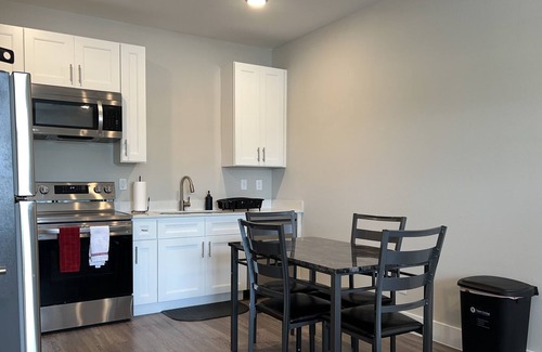 Adjacent to the living area, you'll find a fully equipped kitchen that boasts sleek countertops, modern appliances, and all the amenities you need to prepare your favorite meals. Whip up a delicious breakfast or enjoy a cup of coffee at the cozy dining table before heading out to explore the city.