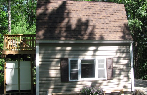 This very small cottage is nestled in the woods on a quiet country road, which is not a touristy location and thats why you pay far less. The cottage was built in 2016 by the Parker's who are semi-retired and live on the other end of the 5 acre property. Spiral stairs lead to second floor bedroom which has one full size and one adult size bunk bed. The bathroom features a modern electric toilet but without sink. OUTDOOR SHOWER ONLY secure and private under deck.
