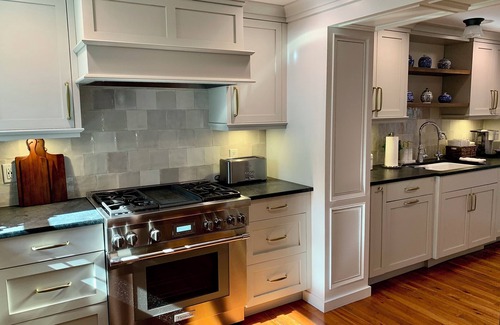 The chef’s kitchen offers a full array of Thermador appliances which include a professional 36” gas stove with griddle & oven, 30” refrigerator/freezer, Scotsman gourmet clear ice machine, wine fridge, beverage fridge, microwave drawer, a countertop Breville toaster oven & toaster, and a Cuisinart pod-coffee maker. The sink has a reverse-osmosis room temperature and boiling water filtration system. The kitchen is completely equipped for all your dining needs.