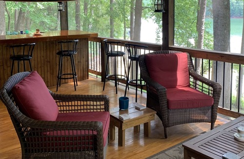 Lake front cottage only 5.5 miles from where the Clemson Tigers play. Enjoy time on the dock, take a dip in the lake. The large porch overlooking Lake Hartwell has plenty of room to lounge and watch your favorite game on the wall mounted TV. A bar with fridge and sink finishes out the porch. Fully equipped kitchen and outside grill will make meals easy. Three bedrooms, 2 full baths. Plenty of room for 6 guest.