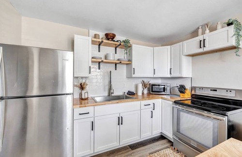 Opening the front door you will find the floors to have all new luxury vinyl flooring and tastefully decorated. Entering into the living room you will notice I have chosen the seating arrangement to be conversational and inviting. This includes an 84” sleeper sofa couch, relaxing furniture, board games, variety of books and a large smart TV. Note: There is also an AC window unit located in the living room during warmer months. If the temperature is hot outside, I recommend to turn the AC unit on when you check in so you can cool the suite off while your outside enjoying the town!