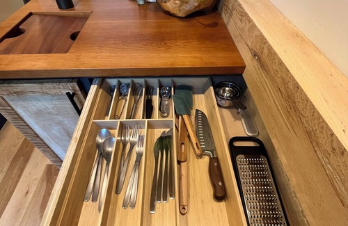 The kitchen includes a two-burner propane cooktop, coffee maker, small refrigerator, sink, and a full assortment of cutlery and spices. As this is a fully contained building, the water is stored in 5-gallon jugs in the closet, and placed under the sink when more is needed. The house contains 25 gallons of water, if you need more, please let us know!