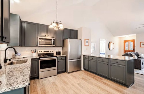 Close to everything when you stay at this centrally-located home in Fuquay Varina. Enjoy a pet-friendly stay in this newly renovated 3 bedroom, 2 bath home with fenced in backyard. You will enjoy the open concept living, dining and kitchen area. Bedrooms provide ample space to spread out. Master bedroom with king bed, bedroom with queen bed, and third bedroom with two twin beds. Kitchen is stocked with upgraded kitchen pots, pans and dishware. Welcome to Whitstone!