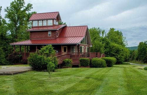Amenities include a fully equipped kitchen, a hot tub, and a spacious wrap-around porch for relaxation and enjoyment. In our commitment to ensuring everyone can experience this retreat, the Lodge is fully accessible, equipped with a ramp and a roll-in shower on the first floor to assist those with mobility challenges.