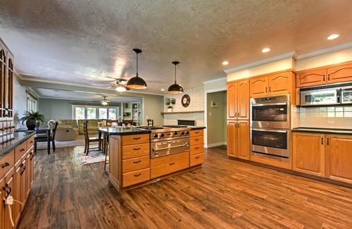 Nestled at the base of the Wellsville Mountains, this sprawling home boasts 4,000 square feet of interior space with a spacious yard, perfect for your next group getaway. Hardwood floors line the living area, where the open floor plan accommodates everyone.