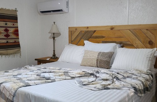 This adorable cabin offers a cozy retreat for guests as well as great venue setting. Many of the features have been created from the pine wood that was removed on the property and you will see it all throughout the cabin, including the beds. This cabin includes a living room with a 55inch Roku TV and a 40 inch Roku TV in the master bedroom. A full king size bed and the cabin also boasts a well-equipped clawfoot bathtub, a shower, heating, cooking equipment, WiFi, and AC for a comfortable stay. This is a brand new development, so join us and be one of the first to explore!
