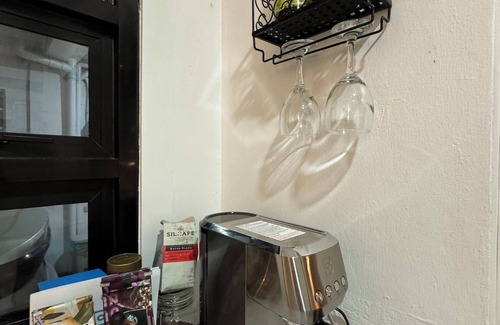 The groundfloor covers a petite coffee space, a comfi sofa, bathroom, mini kitchen equipped with fridge, toaster, electric kettle, frying pan and utensils, induction stove, water pump, heater.