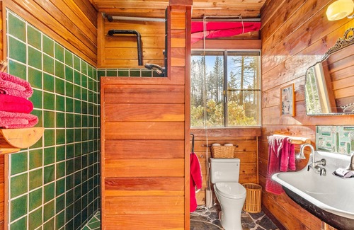 Each of the five bedrooms is lovingly decorated with wilderness mementos. Gaze out at the dazzling night sky from the comfort of your bed. Also in this space, appreciate access to a private washer/dryer, ideal for when you need to clean any garments from a day spent adventuring in the great outdoors. For afternoons full of fun indulge yourself in some playful competition on the home's foosball table. Aside from just the main cabin, you'll appreciate access to the additional "bunk house," these two cabins together make for the perfect sprawling space for a large family retreat. The "bunk house" provides many of the same comforts as the main house, including an additional washer/dryer.