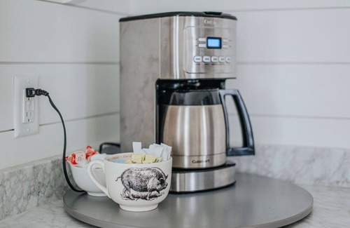 KITCHEN: fully stocked kitchen with a beautiful farmhouse sink, gas range, dishwasher, fridge and a coffee pot (coffee grounds, creamer and sugar provided)