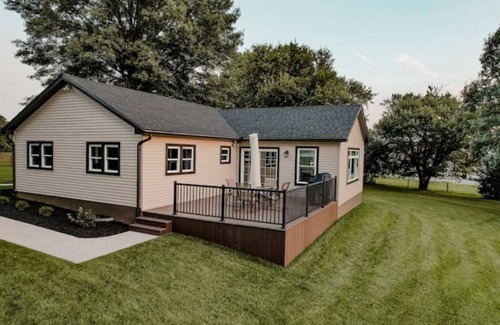 This beautiful home was newly renovated in 2023. It has a fully functioning kitchen, laundry room, and two bathrooms. It is a three bedroom home with a king bed, queen bed, and two bunk beds. The bathrooms have a tub and standing shower. There is a full dining room and two living room spaces. One of the living room spaces has a 15 foot couch for the whole family to enjoy a movie! In addition, there is an outdoor porch with an incredible view of Amish farmland. You can grill out on the patio and take in the peaceful view and atmosphere. There is plenty of outdoor space for games and activities.