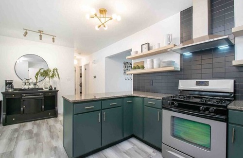 -Kitchen- Just past the living room you will walk into this lovely Modern kitchen with granite countertops, floating shelves and stainless appliances that is well stocked with cooking supplies for all your cooking needs!