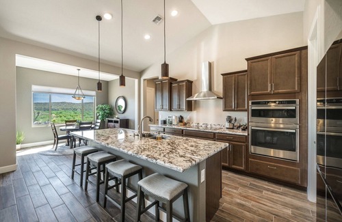 Our home in Wickenburg Ranch has it all! Located an hour from the Phoenix Sky Harbor International Airport and 30 minutes north of Surprise AZ, it’s the perfect location to enjoy the best of both worlds between city and country. We require 1st of the month check-in and end of month checkout. This house is 2200 sq. ft. of comfortable living space and fully furnished with everything needed to make your stay enjoyable and relaxing. An open floor plan gives a large welcoming feel with the primary suite and guest bedroom on opposite sides of the living area. The gourmet kitchen is fully stocked with everything needed to prepare and cook meals including a large walk-in pantry with an additional beverage refrigerator. A home office, complete with printer, is perfect for computer time or remote work. Our backyard is very private and takes in beautiful views of the desert and mountains. It's appointed with a BBQ area, water feature and multiple seating areas including a fire table.
