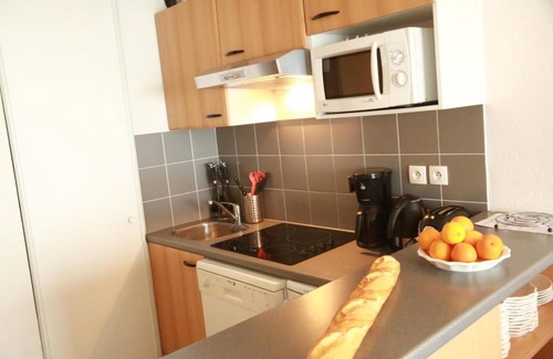 This superb south facing residence is situated in the heart of the resort of Peyragudes, Pyrenees, France, with proximity to the restaurants, bars and shops. It comprises of 84 apartments (designed to accommodate between 3 and 10 people), a reception area with lounge. Each apartment is fully-equipped with a lounge with settee, a small kitchen with 2 to 4 vitro-ceramic plates, a fridge, four microwave ovens, a dishwasher, TV, a bath or shower room, toilets, ski lockers, most of the accommodations have a balcony or terrace. The pistes are about 500m away : free shuttles are available at the foot of the residence. You will benefits of an access at the covered heated swimming pool, sauna and fitness room of the residence. Surface area : about 25-27 m². Living room with sofa-bed. Kitchenette with oven / microwave, dishwasher, 2 vitroceramics cooking rings, fridge. Bathroom with bath-tub, WC.