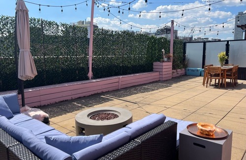 And the huge fully furnished private outdoor space is a rare luxury in NYC. It even has a gas grill, fire-pit, sectional couch, and dining table to enjoy the sunshine, tan, eat outdoors, or for hosting guests.