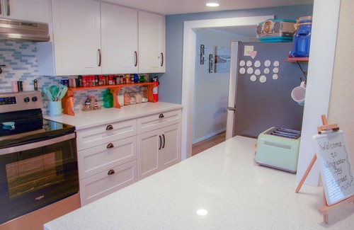 We completely remodeled the main floor down to the studs. This included a new kitchen (Jerri's work of art!) with upgraded flatware, cookware and dishes. Reworked the living room and added a second bathroom with a standup shower (Jay's favorite!). Seven new beds (one queen and six full-sized upstairs.) were brought in. All feature Serta Perfect Sleeper mattresses (same as used by Marriott) with new bedding, and linens. Nearly all windows have been replaced and upgraded. The 55" smart TV has cable access, Blu-Ray and high-speed internet. The bottom floor has been expanded to include a den and gaming room featuring a ping-pong table and foosball. Gone are the roll-up garage doors and a large sliding glass door with a picture window beside it have been added. A new, large capacity washer and dryer set is also now available. The den furniture features a large couch, chair and loveseat (all overstuffed) - arranged around a heater/electric fireplace and 43" smart TV.