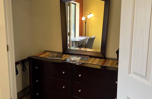 Enjoy a picturesque view of the pool area from your window with a sitting area to relax and enjoy your coffee/tea, etc. This large, vibrant room exudes positive energy with a Southwest vibe. It has its own private entrance with Safe-lock access, a private bathroom with a huge walk-in tiled shower (shampoo, conditioner, body lotion, and hairdryer are provided). A microwave, mini-fridge, coffee maker, coffee, cream, sugar, cups, spoons, paper dishes, and plastic ware are all provided during your stay. The 50” flat screen "smart" TV with DirectTV service. Wireless internet is also provided. This room has a pillow-top king-sized bed, large closet, 6-drawer dresser, 2 nightstands, Electric fireplace for heating and ambiance, USB docking station for charging your electronics, and clock radio.