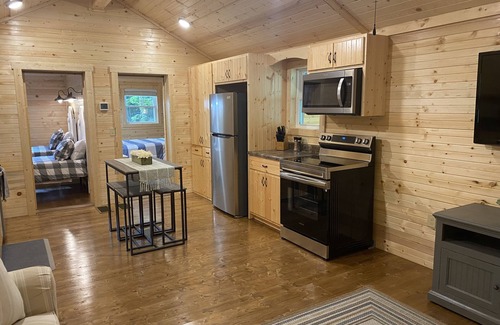 Quiet secluded New cabin, full kitchen, laundry room In each bedroom. Tv in each bedroom with Roku disney +, Amazon prime video, paramount +, Netflix, and Hulu. Lots of near by hiking trails and tubing