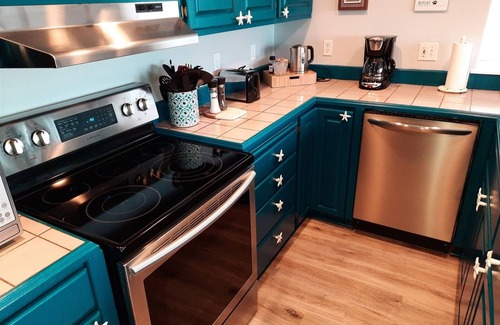kitchen is fully stocked with all the cookware and utensils you might need, coffee and tea station,