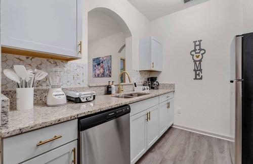 After a day of exploring the parks, retreat to the tranquility of the home where the peaceful atmosphere invites you to relax and recharge for another day of adventures. The cheerful, open interior is a nod to the magic of the parks, as vibrant and eye catching as they are subtle and sophisticated. Curl up for a family movie night on the plush living room sofa and armchair seating while the cool breeze flows from the balcony through the home. The chic, circular dining table can seat 6 for formal meals and game nights alike, with service to and from the kitchen just steps away. The kitchen itself is fully equipped for all your home-cooking needs, showcasing stainless steel appliances, stone countertops, and sleek cabinetry with sophisticated gold accents. All the cookware and dining ware you need is supplied for you whether you’re planning a family-style meal or whipping up a spread of delicious hors d’oeuvres.